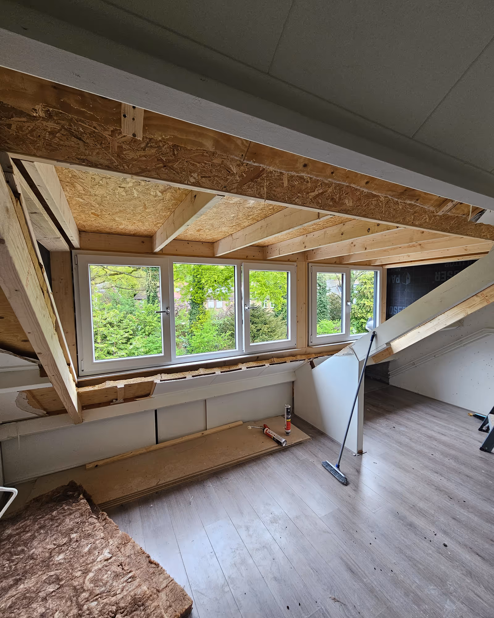 Aan de achterzijde van de woning hebben we een ruime dakkapel van 4,5 meter geplaatst. Dit zorgt voor aanzienlijk meer licht en leefruimte. Voor de kleurstelling is gekozen voor een stijlvol contrast: de kozijnkaders zijn uitgevoerd in helder wit (RAL 9010), terwijl de vleugels en de volledige dakkapel zijn afgewerkt in een moderne antracietkleur (RAL 7016). Het resultaat is een woning die weer jaren vooruit kan, met een eigentijdse uitstraling en verbeterd comfort.